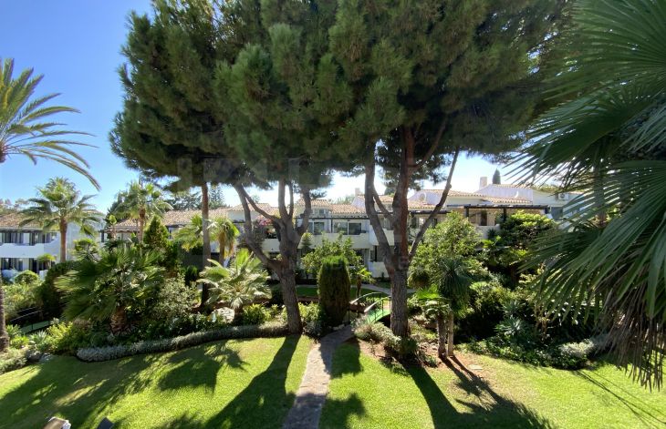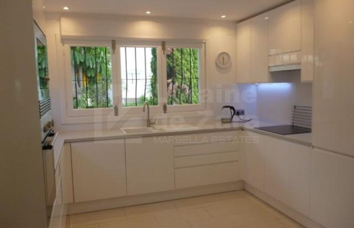 Sunny, fully renovated 80 m² one-bedroom apartment on the first floor of the El Vivero residential complex in Marbella, Balcones de Sierra Blanca, on the Golden Mile. It features a Mediterranean village design, with the apartment spread over two floors surrounding magnificent communal gardens, pond, and pool. Communal parking. It consists of an entrance hall, a spacious living room with a modern, fully equipped open-plan kitchen, a dining area with access to the large terrace that extends to the generously sized bedroom with built-in wardrobes, a full bathroom with a bathtub, and a small laundry room. Air conditioning in the living room and bedroom, a security door, aluminum windows, and new blinds.