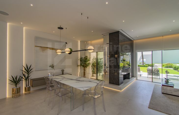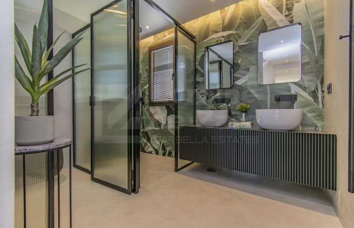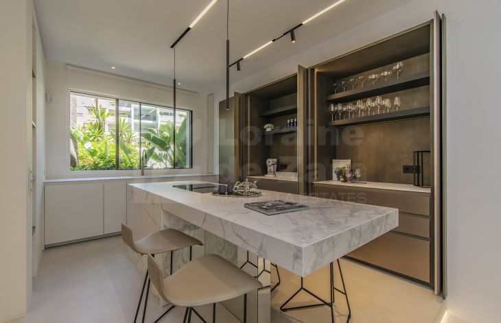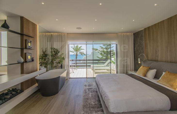 Spectacular, fully renovated and furnished townhouse in an excellent beachfront location on Marbella’s Golden Mile, just minutes from Puerto Banús and Marbella town center, boasting wonderful sea views. The three-story property comprises four bedrooms, two bathrooms, a guest toilet, a living room with an open-plan kitchen, and terraces. Completely renovated, it features a home automation system, underfloor heating, and air conditioning (Airzone). This property is situated in a private residential complex with direct beach access, landscaped gardens, and a communal swimming pool. Ideal for enjoying a Mediterranean lifestyle by the sea.