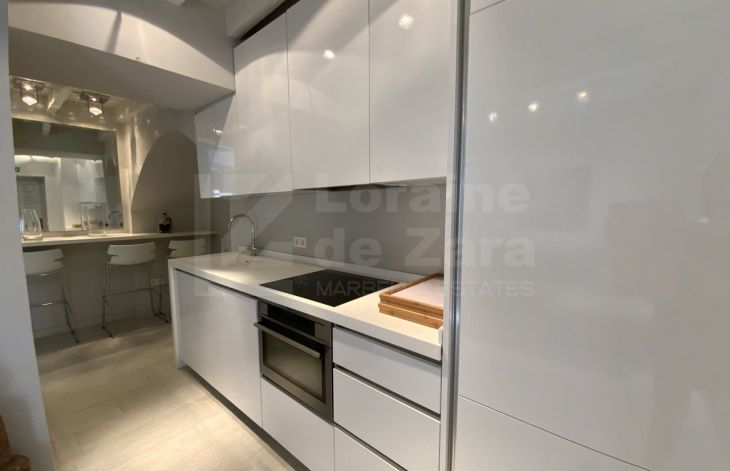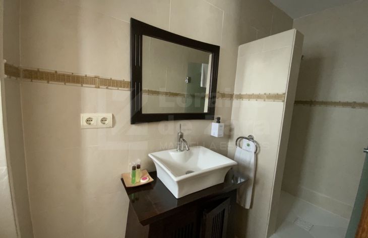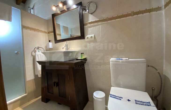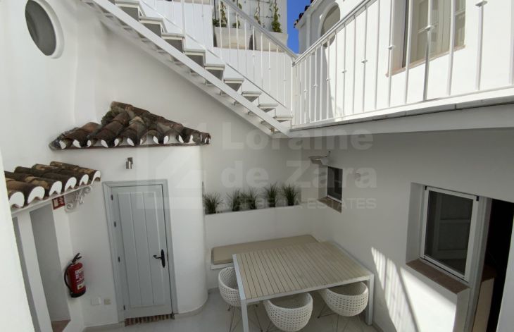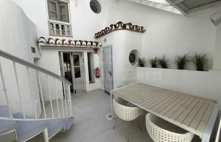 Maravillosa casa de tres plantas con licencia turística en funcionamiento, en perfecto estado en la calle con mas solera del casco antiguo de Marbella, en calle Lobatas, a solo unos pasos de la Plaza de Los Naranjos. La casa consta de hall de entrada que conduce a un espacioso salón con zona comedor con tv y de desayuno con cocina abierta totalmente equipada, todo ello en un espacio acogedor de uso común. El salón con chimenea nos lleva al maravilloso patio también de uso común, con zona comedor y un aseo. En las habitaciones con baño en suite en la planta baja a la que se accede desde el patio dotada de armario empotrado, caja fuerte, tv y nevera así como aire acondicionado, totalmente amueblado con piezas de estilo colonial-balines y mediterráneo así como techos altos propios de la zona del casco antiguo. Escalera de acceso a la planta alta. En la parte principal de la casa encontrmos una suite completa con pequeño salón, vestidor y dormitorio con pequeño balcón al patio, tv, armario empotrado, nevera, caja fuerte y aire aondicionado y baño en suite, muebles de estilo balinés-colonial y mediterráneo. En la planta alta dispone de otra suite con armarios empotrado, nevera, tv, caja fuerte y aire acondicionado, muebles de estilo balinés mediterráneo con techos altos. La casa se completa con un solárium con zona chill-out.