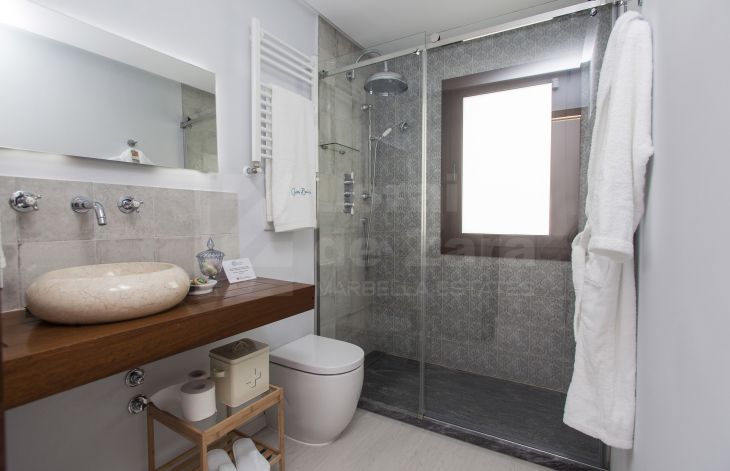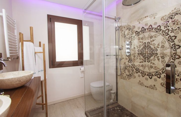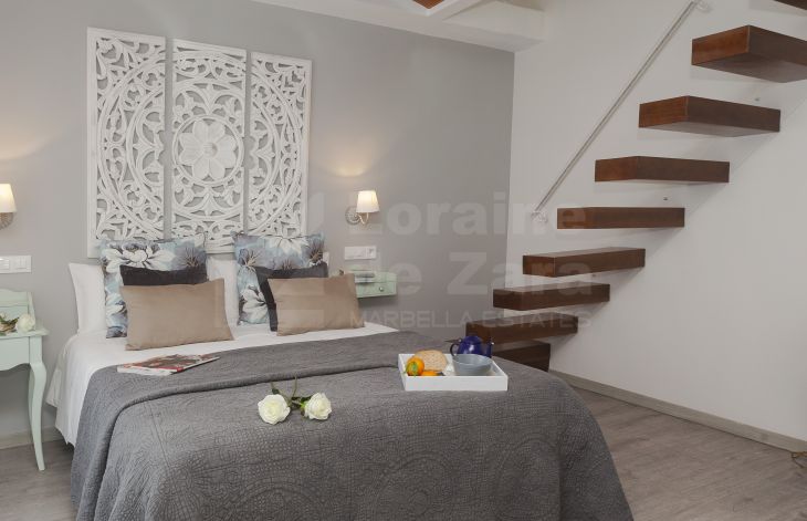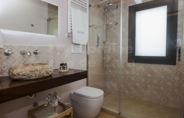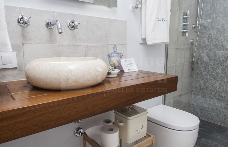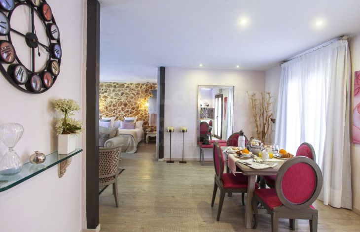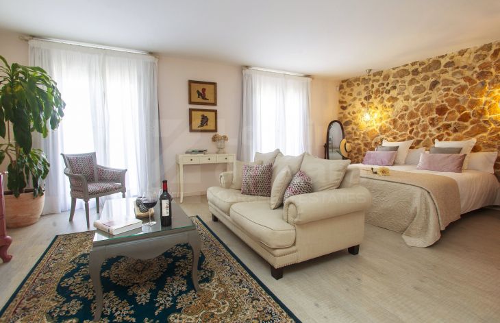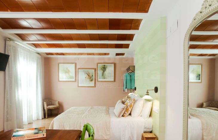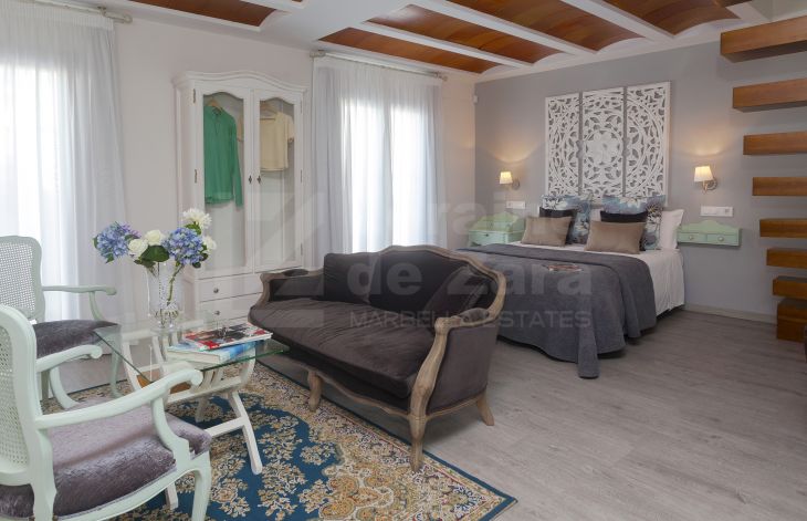 Casa de cuatro apartamentos mas local comercial con encanto y excelente ubicación situada junto al castillo árabe, uno de los puntos mas icónicos de Marbella, en una calle con historia y cercana a cualquier rincón de Marbella, así como del mar. Completamente renovada en 2016 y dotada de los últimos avances en tecnología de construcción, provista de tres plantas y dos grandes terrazas en la cubierta del edificio con un total de 400 m² habitables con sistema eléctrico avanzado y aislamiento acústico, lo que permite que la casa se adapte a tus necesidades. Con un consumo energético mínimo, la iluminación, el control climático y la seguridad quedan integrados en un sofisticado sistema domótico. Como la casa está dotada de dos terrazas en la azotea desde una de ellas podemos disfrutar de tomar el sol y desde la otra se puede crear una zona de chill out con una piscina y solárium (según proyecto). En la planta baja tenemos recepción y cuarto de máquinas (30 m²). En la primera planta encontramos dos apartamentos completos. En la segunda planta otros dos apartamentos con acceso a las azoteas privadas. Los apartamentos de esta maravillosa propiedad reflejan el buen gusto en cada detalle de su distribución, vistas, tamaño y decoración. De los cuatro apartamentos existentes, tenemos dos pequeños, ambos de 35 m² cada uno de ellos con dos balcones y dos grandes (60 m² y 85 m²) con cuatro balcones cada uno de ellos, todos ellos equipados con dormitorios, kitchenettes con mini frigorífico y microondas con grill, baño con ducha de alta calidad y zona comedor, así como acceso a la azotea. Todo excelentemente decorado y agenciado conforme al estilo del casco antiguo. Todos los apartamentos tienen una decoración y disposición especial que los hacen diferentes del resto, con techos altos, lo que les da un aire de lujo y confort. La propiedad también incluye un local comercial, funcionando como restaurante exclusivo, en planta baja de 56 m² con licencia de apertura vigente , aunque potencialmente puede ser destinado a Boutique de lujo, galería de arte, oficina, centro deportivo privado o recepción de hotel boutique, entre otros. Posibilidad de crear tres dormitorios adicionales. Esta casa cuenta con licencia de apartamentos turísticos y ha estado funcionando durante largo tiempo con bastante éxito, por ello al aumentar el número de habitaciones, se incrementaría la capacidad de ocupación