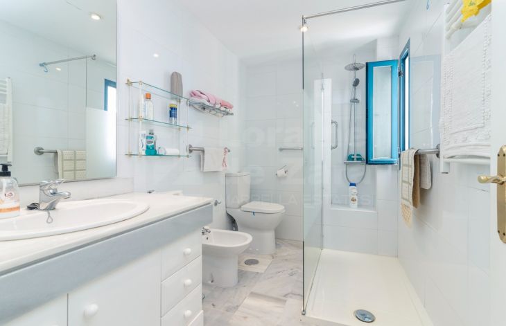 Amplio piso de tres dormitorios con garaje, situado en avenida Ramón y Cajal, en pleno centro de Marbella, dotado de fantásticas vistas al mar y a la montaña, ubicado en una planta alta del edificio en el que se encuentra, en segunda línea de playa y muy cercano al casco antiguo, Muy cómodo por disponer de todos los servicios y comercios alrededor así como de la zona de ocio. A la playa en 2 minutos a pie. Abundante luz natural gracias a la planta donde se encuentra y por su orientación. La vivienda dispone de tres dormitorios amplios con armarios empotrados, dos baños completos, uno de ellos en suite, cocina equipada e independiente con lavadero, espacioso salón con vistas abiertas, dos terrazas, la prncipal con vistas panorámicas increibles, garaje y trastero. Piscina en la cubierta del edificio.
