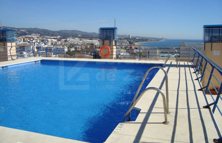 Moderno apartamento totalmente renovado en la última planta de un edificio en el centro de Marbella, del lado playa, a solo unos pasos del mar, así como de todos los servicios, comercios, y solo a unos pocos ...